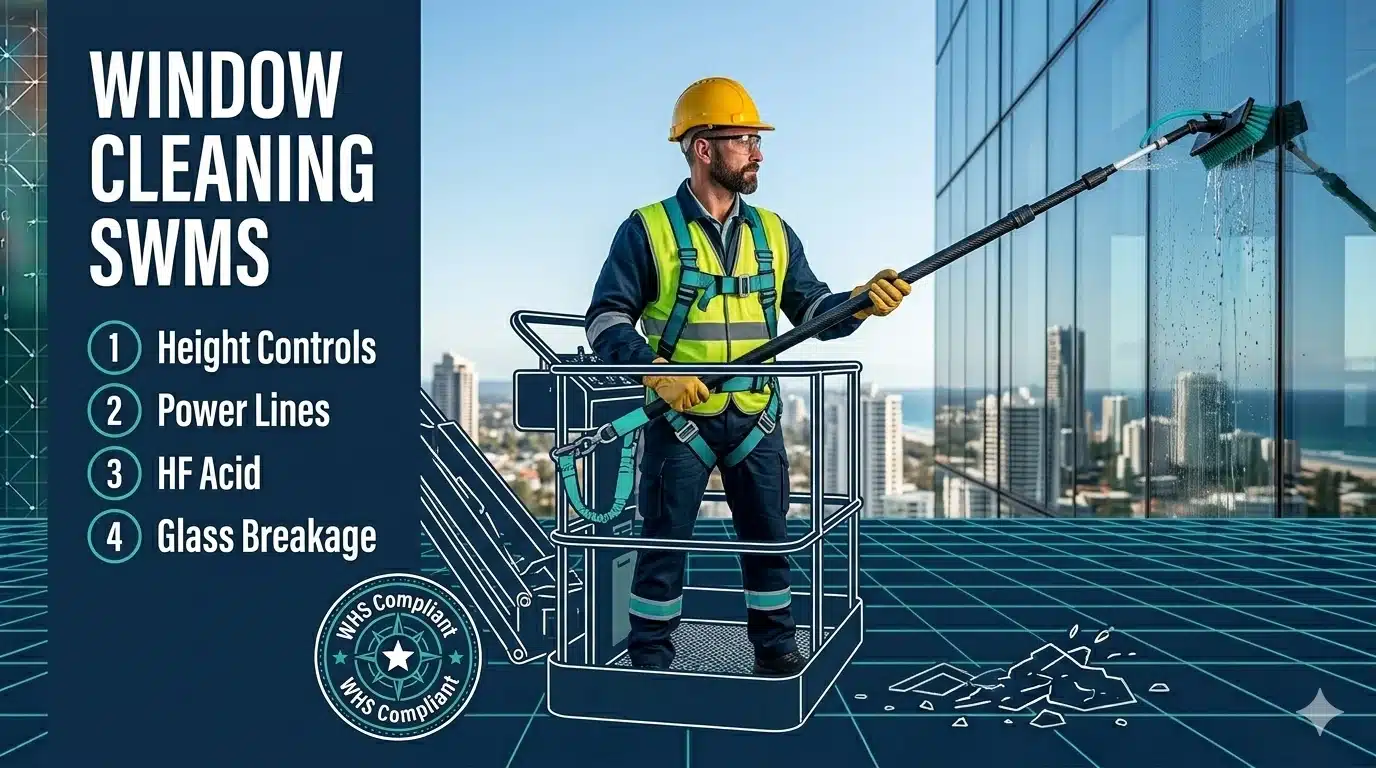 Window cleaning looks straightforward from the ground. From a compliance perspective it is one of the more hazardous cleaning tasks Australian contractors take on — working at height, chemical exposure, powered equipment, live overhead services, and glass breakage risks all in one job. If any part of your window cleaning work involves height above 2 metres, an EWP, or rope access, a Safe Work Method Statement is legally required before work starts.